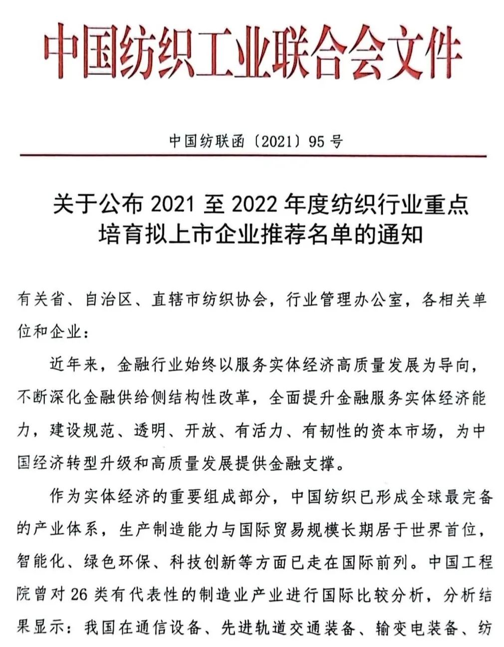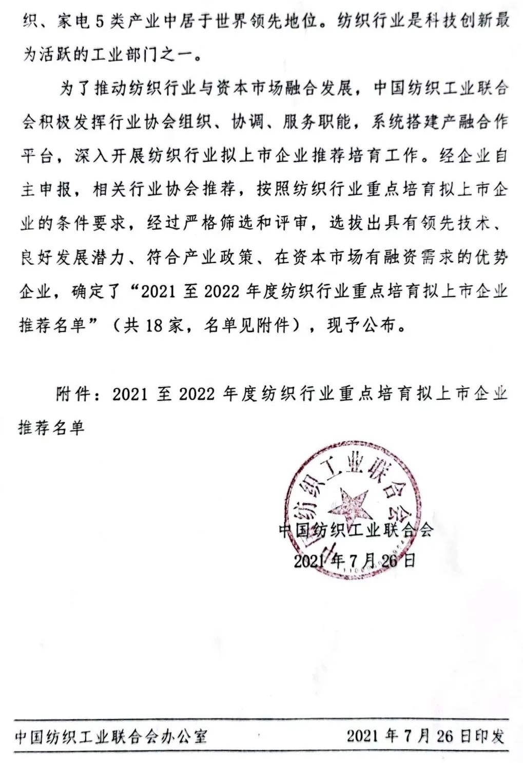 در اولین سال از چهاردهمین برنامه پنج ساله، فدراسیون صنعت نساجی چین در حال تسریع در ادغام صنعت نساجی و بازار سرمایه است. در 26 ژوئیه، فدراسیون صنعت نساجی چین اطلاعیه ای را مبنی بر انتشار لیست توصیه شده از شرکت های کلیدی برای فهرست شدن در صنعت نساجی از سال 2021 تا 2022 صادر کرد. پس از غربالگری و ارزیابی دقیق، 18 شرکت سودمند با فناوری پیشرو، پتانسیل توسعه خوب، در خط تولید شدند. با سیاست های صنعتی و نیازهای تامین مالی در بازار سرمایه برای تشکیل لیست پیشنهادی انتخاب شدند. این شرکتها شامل مواد الیافی جدید، تولید هوشمند، ساخت مد، تولید سبز، منسوجات صنعتی پیشرفته و سایر زمینهها هستند که همچنین حوزههای کلیدی مورد حمایت «برنامه پنج ساله چهاردهم» نساجی هستند.
